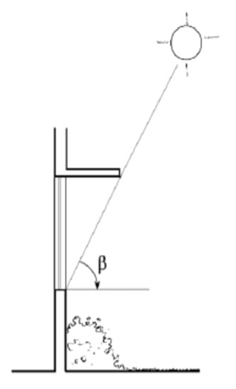 β is shown in Figure 6 and its respective value has been extracted from Iran’s National Building Regulations [] for each city based on its geographical location. β is determined based on the angle of sun’s radiation during warm seasons. Therefore, the shade prevents the entrance of direct radiation into the space during warm seasons. The length of the shades for Sweden were extracted from IDA-ICE software, and it was considered as 1 m for all studied locations.