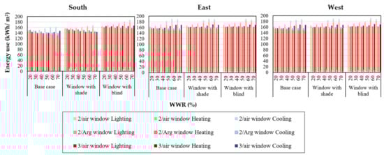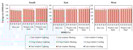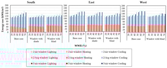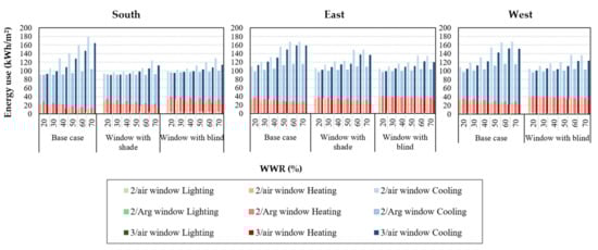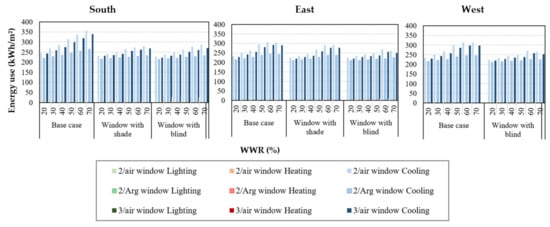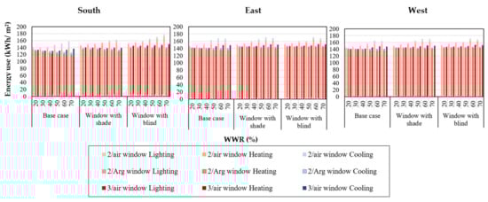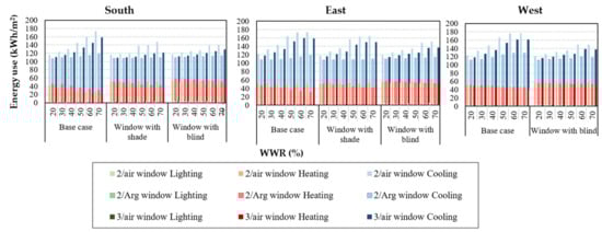 Based on the result shown in Figure 13, as in the previous section, heating is the main aspect of total energy use. For the southern exposure, the first case, where no shade or blind is employed, appears to be the most agreeable situation. The WWR range of 20–70% is considered for the 2/Arg and 3/air windows, as the fluctuation in heating as well as total energy use is negligible (5%). As in the previous section, in this climate condition, the larger WWR is more favorable when using the 2/Arg window for the base case. A more appropriate WWR range of 50–70% for the 2/Arg window could be considered. Because the heat gain is dominant compared to the heat transmission from the window, the larger windows appear to be the better option. This is mainly due to the low U-value (1.1 W/m2·K) of the window, which reduces the heat transmission loss. A range of 30–70% and 30–50% also could be considered for 3/air and 2/air windows.