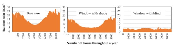 In the third case, for each window, on different orientations, an automatic blind with a solar gain multiplying factor of 0.39, short-wave shading coefficient (T) multiplying factor of 0.12, and window U-value multiplier of 0.87 was considered between the window panes. Blinds are controlled by the amount of sunlight. When the solar radiation exceeds 100 W/m2 on the outer surface of the window, the blinds are drawn to cover the window completely. The sensors are of the “sun sensor” type that react to the amount of the sun’s incident radiation. This amount can be reported in either W/m2 or lux []. Light sensors were also implemented in this case.