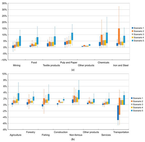 Scenario 2 eliminates tax exemptions and refunds for certain industries, so the price increases were large in the iron and steel (median 9.3%) and chemicals (median 4.6%) sectors, which benefited the most from tax exemptions and refunds. Agriculture, forestry, and fisheries sectors also lost their tax exemptions and refunds, but this was offset to some extent by the effect of lower gasoline and diesel delivery taxes. Although direct comparisons cannot be made due to differences in carbon tax prices and assumptions, these trends were similar to those reported in a previous study [11].