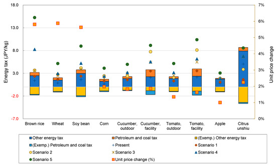 Apples and Citrus unshiu are examples of fruits. For apples, the total amount of energy taxation was relatively low at JPY 3.1/kg in Scenario 5, and the rate of change in the product price was low at 1.0%. Citrus unshiu consumes a large amount of diesel oil; in Scenarios 2 and 3, when the carbon tax was fully implemented, the tax amount was lower than the present amount because the diesel oil delivery tax was eliminated. However, in Scenario 5, the tax was JPY 8.6/kg, and the rate of change in product prices increased by as much as 2.2%.