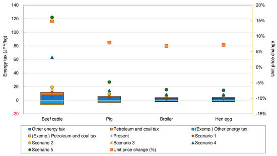 The amount of energy tax per kilogram of livestock body weight is shown in Figure 3. The current tax rate for beef cattle was JPY 5.1/kg, but it increased to JPY 16.4/kg (1.4% increase in unit price) in Scenario 3, JPY 63.2/kg (7.3%) in Scenario 4, and JPY 122/kg (14.8%) in Scenario 5. In particular, the impact of CH4 from the digestion process and livestock manure treatment contributed significantly to these increases. For eggs, broilers, and pigs, the rate of change in product prices due to the introduction of Scenario 5 was 6.8–7.9%, while for beef cattle, it was 14.8%. The unit price of beef products was higher than that of eggs, broilers, and pigs, and this was a significant price increase.