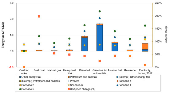 Japan’s carbon tax is relatively low compared to that of other Organisation for Economic Co-operation and Development (OECD) member countries [1]. The Ministry of the Environment of Japan launched a subcommittee on carbon pricing and considered strengthening the carbon tax [31]. However, no concrete plan has been presented for the height of the carbon tax or other energy taxes. Therefore, in addition to the present situation, this study set up five taxation scenarios and analyzed their impact on product prices (Table 4).