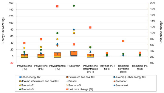 The tax changes in the major plastic materials are shown in Figure 5. In this figure, the results are shown for common plastics such as polyethylene (PE), polystyrene (PS), and polyethylene terephthalate (PET) as well as for engineering plastics, such as polycarbonate (PC) and fluororesin. The results for the major recycled plastics are also presented. Since the market price of recycled plastics is uncertain, the price was calculated to be half that of primary plastics.
