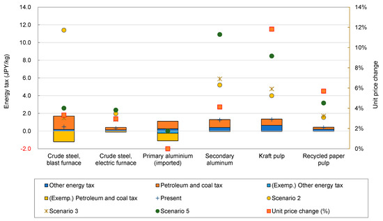 There are two types of aluminum: primary aluminum, which is produced from bauxite, and secondary aluminum, which is made from scrap. The production of primary aluminum consumes large amounts of electricity. The last primary aluminum production plant in Japan was closed at the end of March 2014, and Japan is now entirely dependent on imports. Therefore, all GHGs from primary aluminum production processes is emitted overseas and were not subject to a carbon tax. The tax amount of primary aluminum was JPY 0.0/kg, but the tax amount of secondary aluminum in Scenario 5 was JPY 10.9/kg, which increased the product price by 4.1%.