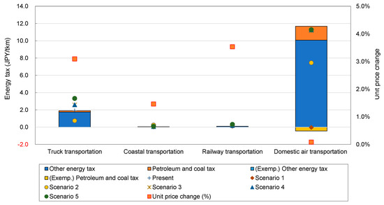 A similar trend was observed for the amount of taxes on domestic air transportation. In Scenario 1, aviation fuel on regular domestic routes was exempted from the carbon tax, making it lower. In Scenario 2, where aviation was no longer exempted from the tax, the tax increased to JPY 7.4/tkm, but was still lower than the present price because the aviation fuel tax was eliminated. In Scenario 5, price changes were small for both coastal transportation and air transportation, although they were not zero because of the impact during fuel production. Railway transport increased in price by 3.5% in Scenario 5, owing to higher electricity prices.