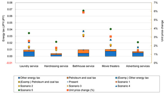 The change in the tax per yen for some service activities is shown in Figure 8. For each service, the tax amount increased as the carbon tax increased. In particular, the tax on bathhouse services increased from JPY 0.01/JPY to JPY 0.07/JPY in Scenario 5. This is equivalent to a 5.9% increase in the price of services. Many bathhouse sites use fossil fuels for their boilers, so they are susceptible to the carbon tax hike. On the other hand, hairdressing and advertising, which are high value-added services, were less affected by the carbon tax hike, and in Scenario 5, the service price increase was only 1.4% and 1.8%, respectively.
