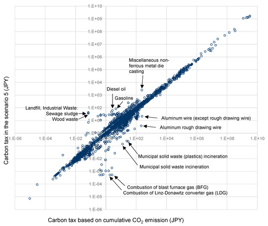 Figure 9 plots the hypothetical tax amount calculated by imposing a carbon tax of JPY 10,000/t-CO2 on the cumulative CO2 emissions of the products included in IDEA ver. 2.3, and the calculation results of the tax amount in Scenario 5. The cumulative CO2 emission is the total amount of CO2 emitted until the product is provided. The results of the calculations for CO2 emissions and Scenario 5 show almost the same trend, with a correlation coefficient of 0.990.