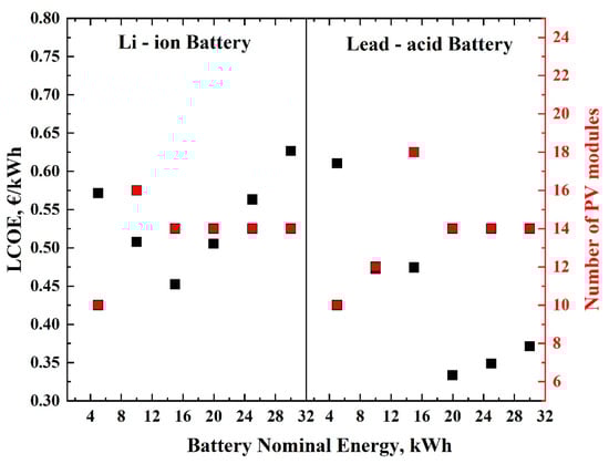 | Battery Type | N (mods) | Bnec (kWh) | Component Cost | Installation Cost (EUR) | Maintenance Cost | Operation Cost | Eus (kWh/year) | LCOE (EUR/kWh) | |||||
