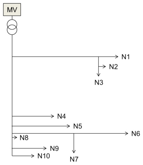 The proposed algorithm was tested in the feeder shown in Figure 2. The test feeder was developed in the study ’Merit Order Netzausbau 2030’ (MONA) and is a three-phase 21-bus system [37]. It can be considered a European low voltage distribution grid with ten residential households at a voltage level of 400 V and a frequency of 50 Hz. The test feeder was modeled in MATLAB Simulink and exported to the training environment in Python as a functional mock-up unit (fmu-file) with FMIKit [38].