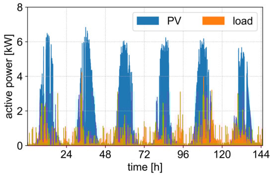The simulation scenario combines distributed generation through photovoltaic (PV) at every household (N1 to N10) together with individual active and reactive loads from the households. For this, load profiles by Tjaden et al. [39] were used that provide three-phase values for active and reactive power at every second. The first ten profiles were utilized. For the PV feed-in, a normalized PV profile [40] was multiplied by a fixed factor for every household (see Table 2) to model different PV sizes. These factors were chosen randomly around an average PV size of 5 kWp for residential PV installations. For all following simulations, the three phases are assumed symmetric; thus, only the results of phase A are presented. Figure 3 shows the load and PV profile at node N10 exemplarily.