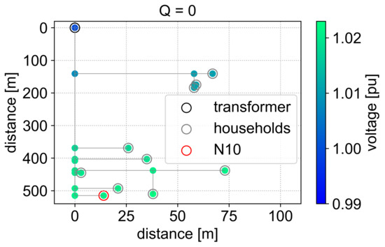 Figure 4 shows the voltage topology in the test feeder with zero reactive power feed-in for a static grid situation. As input data, the values from the load and PV profiles were used as listed in Table 2. The x- and the y-axis indicate the distance to the transformer. The transformer is circled in black, the households in gray. The fill color of each bus indicates its voltage.