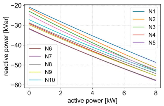 The reactive power demand in the test feeder was analyzed. Based on the test feeder, it was investigated how much reactive power is necessary to regulate the voltage to 1 pu under static PV feed-in. For this purpose, the reactive power at the grid connection point was systematically varied for different in-feeds with fixed active power until a voltage of 1 pu was observed. With exception of the node under consideration, all other nodes were kept constant according to Table 2. By this, the demand of reactive power was recorded as a function of the active power injection and is shown for every connection point in Figure 5.