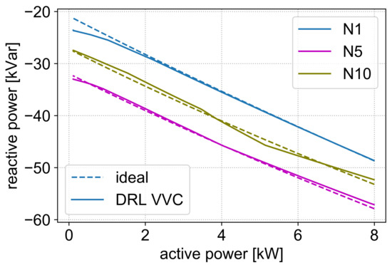After the training process the active power was increased from 0 to 8 kW in 1000 steps to determine the characteristic curve for the reactive power output. The simulation has been carried out for the nodes N1, N5, and N10. As a result of these simulation runs, Figure 6 shows the reactive power over the active power. These characteristic curves can be interpreted as the reactive power curves learned by the DRL agent. These characteristic curves match very well with the corresponding ideal characteristic curves calculated in Section 3 and also shown in Figure 6.