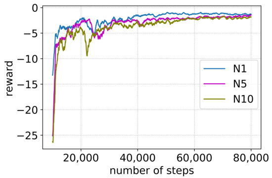 To visualize the training process, the moving average reward is shown in Figure 7. The moving average reward was calculated over 1000 successive learning steps at the three different nodes, N1, N5, and N10.