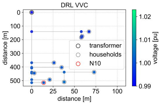 To investigate the effect of the DRL algorithm on adjacent nodes while applying the self-learning volt-var control at node N10 (red circle), the voltage at each bus was evaluated. The resulting voltage topology is presented in Figure 8. The x- and the y-axis indicate the distance to the transformer, whereas the fill color of each bus indicates its voltage.