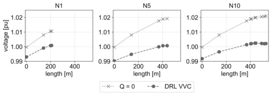 Without reactive power injection, the transformer voltage is 1 pu and rises up to 1.011, 1.019, or 1.021 pu, depending on the length of the line. The longer the line, the stronger is the voltage rise. Using the proposed volt-var control, the voltage at the respective node is lowered to 1 pu, with the result that the voltage along the line to the transformer continues to drop. The transformer voltage ranges between 0.99 and 0.993 pu for the different cases. In order to regulate the transformer voltage to 1 ± 0.002 pu, as well, and thereby further reduce the voltage differences along the line, a combination of various smart inverters at different nodes could be investigated in future studies. Nevertheless, with the proposed DRL VVC algorithm the voltage differences along the line were reduced significantly by up to 50% in this case study.