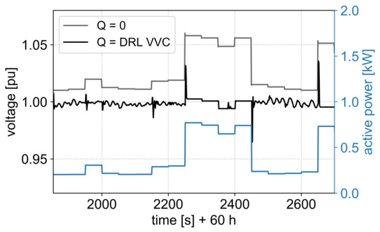 The self-learning volt-var control was located at node N10 as an online-learning algorithm without any additional knowledge or previous training. After only 3 simulated days of online training, the agent was able to balance the voltage at its connection point within the given interval; thus, the voltage rise at node N10 was eliminated. During the DRL training process the voltage deviations never exceeded the deviations of the reference without VVC. However, an inherent problem was observed. Every time the active power feed-in changes, a voltage peak occurs, due to the fact that the algorithm has a delay of one step because of the measurement duration. Thus, there is a time lag between the voltage change and the response of the algorithm in form of reactive power injection. Despite these voltage peaks, a significant voltage reduction was achieved with the proposed DRL agent compared to the voltage curve without reactive power injection. Figure 10 shows a section of the voltage behavior with and without VVC at node N10.