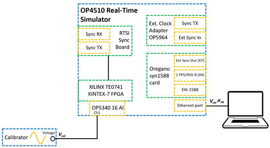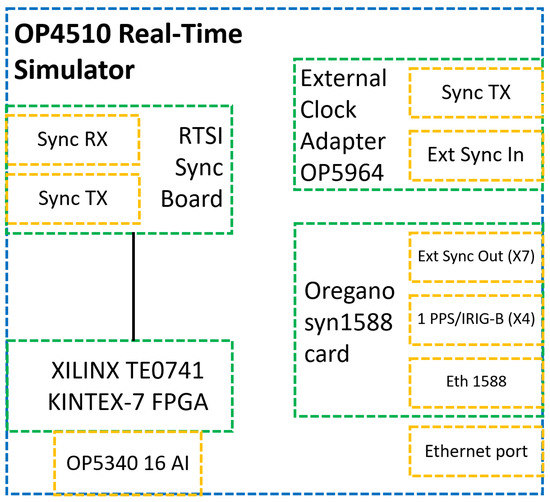 Starting from the processing unit of the developed SAMU, the OPAL-RT OP 4510 Simulator was a Real-Time Simulator (RTS) dedicated to performing real-time simulations and HIL applications using RT-LAB software. The main components constituting the RTS used are presented in Figure 2. The color code used in the figure is valid for all the following ones given in this work: blue, device boundaries; green, internal components; yellow, I/O interfaces or available connections.