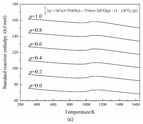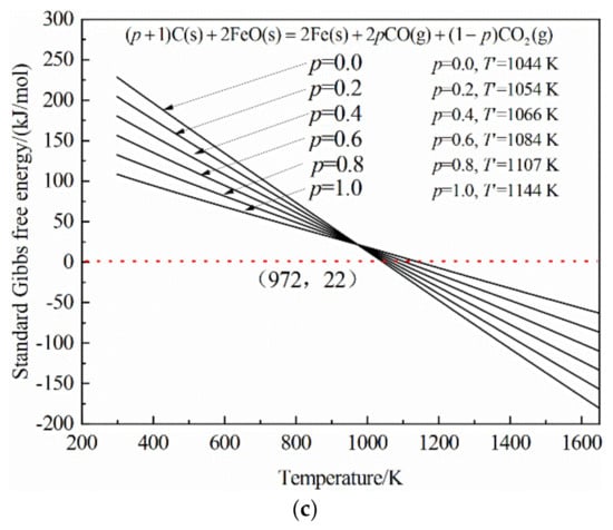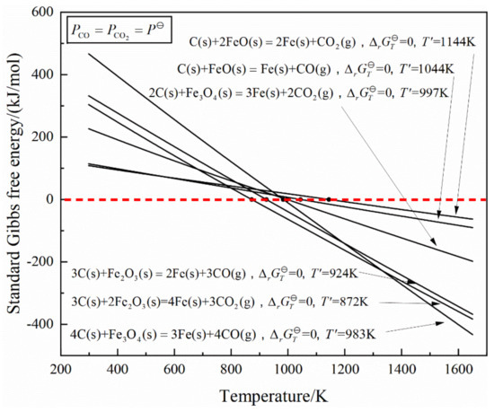 and , the temperature T′ was the lowest critical temperature at which the reaction could start. The critical reaction temperatures for the reduction reactions of iron-containing raw materials Fe2O3(s), Fe3O4(s), FeO(s) with C(s) to generated CO2 were 872 K, 997 K, 1144 K, respectively. The critical reaction temperatures for the reduction reactions of iron-containing raw materials Fe2O3(s), Fe3O4(s), FeO(s) with C(s) to generated CO were 924 K, 983 K, 1044 K, respectively. The lowest critical temperature of carbon and iron oxides was at 872 K for the reaction 3C(s) + 2Fe2O3(s) = 4Fe(s) + 3CO2(g), and the highest temperature was at 1144 K for the reaction C(s) + 2FeO(s) = 2Fe(s) + CO2(g).