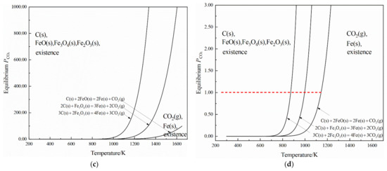 According to Table 2 and Equations (23)–(27), the equilibrium relative gas partial pressure of CO and CO2 of reduction reactions between carbon and iron oxides were calculated, and the graphical representation of these functions was shown in Figure 4. Figure 4a,c displayed the global y-axis as 0–1000, and Figure 4b,d displayed the local y-axis as 0–3 to display comparative connections of different raw materials. All the curves in Figure 3 increased with rising temperature, and the y-axis coordinate values could be more than 100 when the temperature was more than 1200 K. Figure 4 shows that the equilibrium relative gas partial pressure of CO or CO2 at the same temperature in order from high to low were Fe2O3(s), Fe3O4(s), FeO(s).