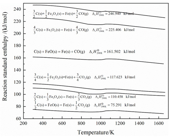 According to Table 2 and Equation (21), the standard enthalpy function per mole iron produced by reduction reactions was calculated, and the graphical representation of these functions was shown in Figure 5. Table 4 demonstrates the data of the reaction energy consumption per ton metallic iron produced at the temperature range of 298–1650 K. The reduction temperatures of 1173 K, 1273 K, 1373 K, 1473 K, 1573 K, 1650 K were set to evaluate the energy consumption of reduction reactions.