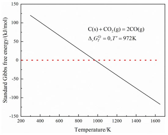 According to Table 2 and Equation (8), the standard Gibbs free energy of gasification reaction between carbon and CO2 was calculated, and the graphical representation of these functions was shown in Figure 6. When , the reaction of C(s) + CO2(g) = 2CO(g) went forward.