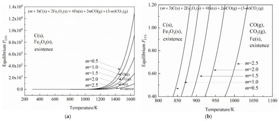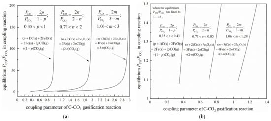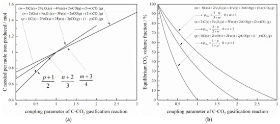 The coupling reactions equations of the C-CO2 gasification reaction and C-FexOy direct reduction reaction were shown in Equations (34), (37) and (40), and m, n, and p were coupling parameters for Fe2O3 (s), Fe3O4 (s), FeO (s), respectively. Due to the existence of CO2, the variation range of m, n and p were fixed as 0 ≤ m ≤ 3, 0 ≤ n ≤ 2, 0 ≤ p ≤ 1, respectively. Equations (35), (38), and (41) were the isothermal equations between the Gibbs free energy and gas partial pressure. According to the ratio of the gas partial pressure of CO and CO2, the Equations (36), (39), and (42) were used to calculate the equilibrium gas partial pressure and the equilibrium gas volume fraction.