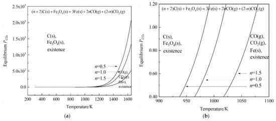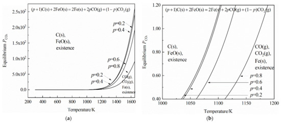 For the varied sum value (0.4, 0.6, 0.8, 1.0, 1.2) of the relative gas partial pressure of CO and CO2, the equilibrium was displayed in an S-shaped curve in Figure 7. The relative gas partial pressure of CO increased with the sum value increasing at the same temperature. The curves in Figure 7a increased slightly at with and jumped sharply at about , and then remained stable at with .