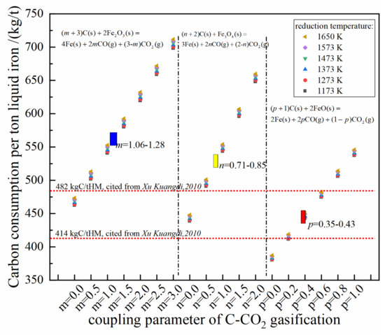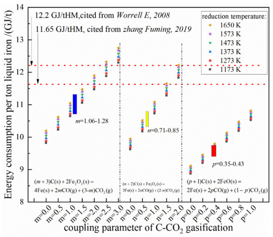 To make the energy consumption of ironmaking process less than the reported value, the coupling parameter m < 2.0 was required for the reaction of (m + 3)C(s) + 2Fe2O3(s) = 4Fe(s) + 2mCO(g) + (3 − m)CO2(g), and the coupling parameter n < 1.5 was required for the reaction of (n + 2)C(s) + Fe3O4(s) = 3Fe(s) + 2nCO(g) + (2 − n)CO2(g).
