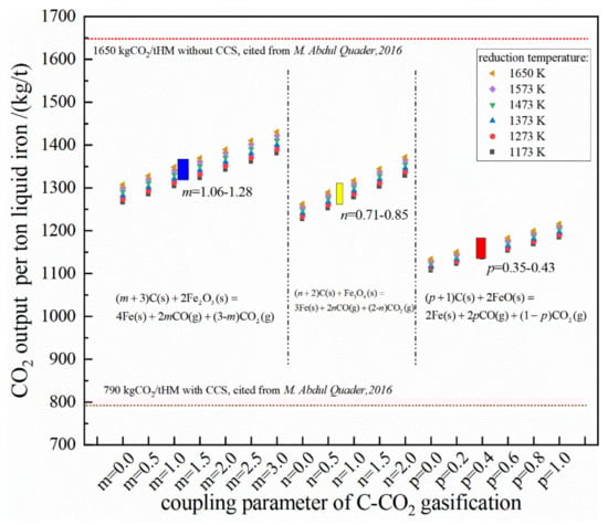 The CO2 output per ton of liquid iron of varied coupling reactions.