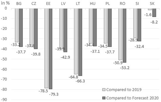 With the help of the regression analysis covering the years 2008–2019 discussed above, the authors determined which variables influenced the level of GHG emissions from the tourism sector in each of the CEE countries. The results of these analyses and the data about the situation in the tourism sector in 2020 (the situation in 2020 had been determined basing on data from January–September 2020, i.e., the period for which the data were available) were then used to estimate the actual values of pollutant emissions in each of the examined countries in 2020. These data on emissions in 2020 (i.e., the period of the pandemic) were then compared with the level of GHGs emitted by the tourism sector in 2019, i.e., the period when pandemic had not started yet. In this way, it was possible to estimate what environmental change occurred relative to 2019 and to identify the impact of this pandemic on the environment, and more specifically, on changes in the level of GHGs emitted by the tourism sector.