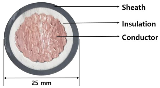 Cables used in NPPs must pass certain fire resistance tests including IEEE-383 (IEEE Standard for Type Test of Class 1E Electric Cables, Field Splices and Connections for Nuclear Power Generating Stations) [17] and IEEE 1202 (IEEE Standard for Flame Testing of Cables for Use in Cable Tray in Industrial and Commercial Occupancies) [18] according to NUREG (Nuclear Regulatory Report)-0800 [19] and the regulatory guidelines of the Nuclear Regulatory Commission (NRC). This test standard is a flame retardant performance measurement carried out through a vertical tray flame test (VTFT), which should demonstrate that flames do not spread even if the sheath or insulation of cables at the flame contact area is damaged for 20 min of test time. In this study, a non-class 1E cable that passed the VTFT was used. As shown in Table 1 and Figure 1, the cable is used for power supply and control and consists of a polychloroprene rubber (CR)-based sheath, ethylene-propylene rubber (EPR)-based insulation and a bundle of conductive copper wires. The outer diameter of the cable is 25 mm. The item number of the cable is 600 V FR-PN 1 C × 300 MCM cable. Herein, FR is flame retardant; PN means EPR insulation and Neoprene (CR) sheath; 1 C is 1 core.