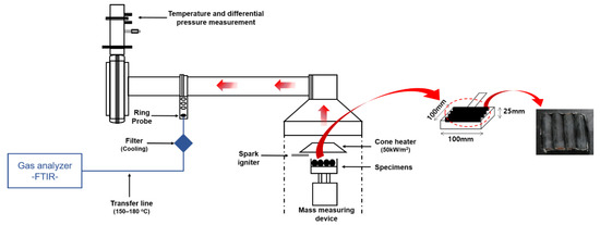 Schematic and specimen of a cone calorimeter FTIR (Fourier Transform Infrared Spectroscopy) test.
