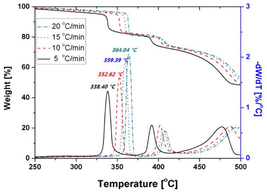The TG analyzer is a useful tool for analyzing the thermal decomposition and pyrolysis of materials using TG and differential thermal analyses according to the heating rate [20,21,22,23]. From the TG experiments, the exothermic peak temperature (Tm), which is a unique property of the material, could be measured and it varied with respect to the heating rates.