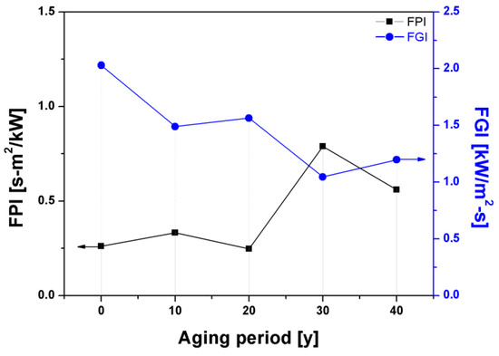 Fire performance index (FPI) and fire growth index (FGI) with respect to the accelerated aging periods.