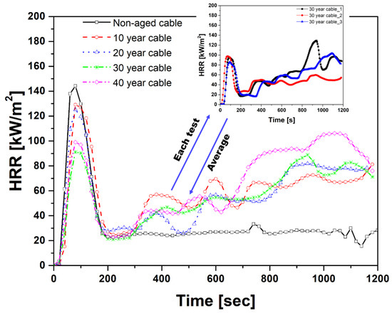 Figure 6 verifies the PHRR trend at 80 s as discussed in Section 3.2 followed by repeated instances of an increase and decrease in the HRR. The HRR characteristics in the late period (after 900 s) showed that the measured final peak value was larger than the initial peak value in the 30 and 40 year accelerated aged cables. This was due to the steady heat release from the split occurrence in the cable’s char layer because of continuous pyrolysis and combustion, which agreed with the results of Seo et al. [42]. Flame retardants are added to non-class 1E cables for NPPs to comply with a certain level of fire protection capability and they play a role in increasing the formation of the char layer and reinforcing cable strength [43]. In addition, Zhengzhou et al. [44] reported that the char layer formation delayed the pyrolysis by blocking heat penetration, which was also observed in the present study. The HRR curve of the non-aged cable was maintained at 25 kW/m2 after 80 s whereas that of the accelerated aged cables showed a tendency to increase continuously. It could be judged that as the accelerated thermal aging progressed beyond 10 years, the flame retardant performance deteriorated. This caused the unstable formation of the char layer, thereby generating constant pyrolysis and combustion. Thus, higher HRR values were displayed in the mid and late periods of combustion.