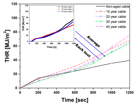 The mean THRs of the non-aged cables and the 10, 20, 30 and 40 year accelerated aged cables were calculated as 40 MJ/m2, 69 MJ/m2, 65 MJ/m2, 64 MJ/m2 and 77 MJ/m2, respectively, as shown in Figure 7. As the accelerated thermal aging progressed, the heat release increased due to a reduced flame retardant performance, a weakened bond between the molecules and the instability of the char layer. The increased heat release increased the fire risk in the accelerated aged cables as the initial fire transformed into the fully developed fire.