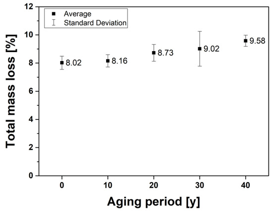 where mo is the initial mass and mf is the final mass. The mean MLs of the non-aged cables and the 10, 20, 30 and 40 year accelerated aged cables were 8.02%, 8.16%, 8.73%, 9.01% and 9.58% and the SDs of the ML were 0.47, 0.44, 0.60, 1.24 and 0.40, respectively. The ratio of the SD to the mean ML was between 4.1% and 13.7% so it could be judged that the ML results had a reliable repeatability.