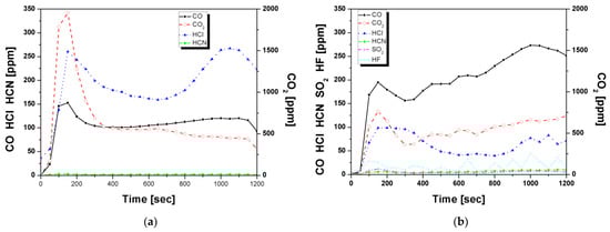 The similar emission trends of CO with CO2 could be clearly seen for all cases (Figure 9), which signified that both CO and CO2 were released concurrently as combustion progressed. These two emission gases are major components of product gas and affect the toxicity in the largest portion. The CO released by the non-aged cables showed a peak value of approximately 150 ppm at 150 s and was maintained at approximately 100 ppm. However, CO released by the accelerated aged cables was approximately 250–300 ppm after 150 s. CO gas could be formed due to the oxidation of char [28] and the aforementioned unstable char layer could promote the oxidation of the char layer as the accelerated aging progressed. It is notable that the whole emissions of CO and CO2 during the combustion time until 1200 s increased with the aging period while the initial emission of CO and CO2 during the combustion time until 200 s decreased as the aging period increased. These results coincided with the results obtained from the HRR and the THR, which had similar time series trends with these emission data because both the release and emission gases were products of the combustion reaction and indicated how much the cables were well burnt.