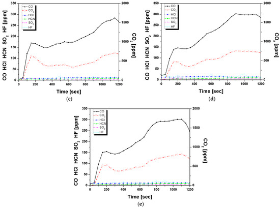 Time series combustion gas emissions of (a) non-aged cable; (b) 10 year accelerated aged cable; (c) 20 year accelerated aged cable; (d) 30 year accelerated aged cable; (e) 40 year accelerated aged cable.