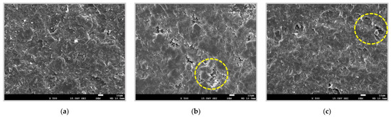The SEM equipment was used to analyze changes in the surface structure of the sheath and insulation with accelerated aging. An EDS microanalysis was conducted to obtain information on the elemental composition of the sheath and insulation. Figure 10 shows the SEM images of the insulation with accelerated aging. In the aged cables, voids and cracks were observed, as shown by the dotted yellow circles in Figure 10b,c. These small voids and cracks could be newly formed and expanded through the accelerated thermal aging, which was also observed in [53]. The voids and cracks significantly degraded the flame retardant performance of the cables by allowing oxygen penetration into the cable sheath.