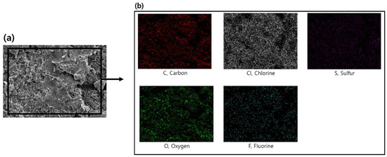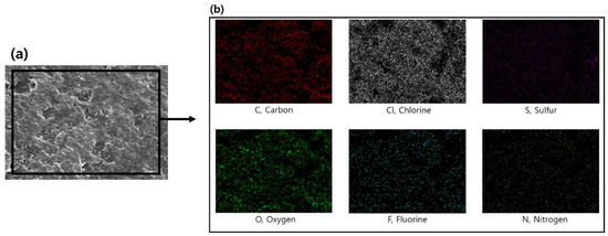 Figure 11 and Figure 12 show the SEM image matrix, as demonstrated by EDS elemental mapping of the sheath and insulation. As seen in Figure 11 and Figure 12, the flame retardant components were identified to include the halogenated elements F and Cl and the additive of S, which matched well with the FTIR results in Section 3.4. The chemical elements were homogeneously distributed on the surface and also supported the reliability of the experiments and materials in this study. Other cases of non-aged and aged cables showed similar results, which included carbon, chlorine, sulfur, oxygen and fluorine so it could be confirmed that these elements were contained in the non-class 1E cable.