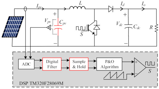 The high switching frequency of the boost converter and the process of analog to digital conversion of and results in high-frequency noise in these signals. This noise, if untreated, leads to reduced efficiency of the PV system and/or system instability. The use of digital filters in experimental studies is imperative due to the presence of non-idealities and the high-frequency noise added during ADC sampling. Literature suggests that the first-order low-pass filter described by Equation (2) is adequate to filter the high-frequency noise [13,23].
