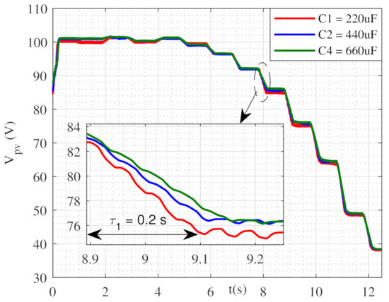 It is imperative from Equation (1) that for a given operating point on PV curve, the values of and remain unchanged and the time (t) taken for charging and discharging of capacitor varies directly depending on the value of . Hence the settling time of the responses of and increases with increase in and vice versa.