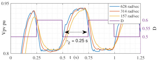 The response of for the different cut-off frequency of the digital filter is recorded in Figure 7. The employed filter eliminates the high frequency noise. In addition, it introduces the delay and the attenuation in these signals. The delay introduced in the signal further adds to increase in settling time of the signal as seen by the controller. If the cut-off frequency of the filter is limited to very low value to reduce the ripple content, signal will be delayed accordingly. This delay introduced by filter into the signal will further increase the settling time of the response of the and . Hence, the settling time of the and should be calculated after they are subjected to the filter. Also, it is recommended that the same digital filter be used to filter noise from and to maintain uniform delay and attenuation. This will ensure appropriate decision making by P and O algorithm. A low-pass digital filter with cut-off frequency of 628 rad/s (100 Hz) is employed in the present experimental studies resulting in effective time constant of 0.25 s () as seen from the controller. It is to be noted that represents the cumulative delay (system time constant () + digital filter delay) not the delay caused by digital filter alone.