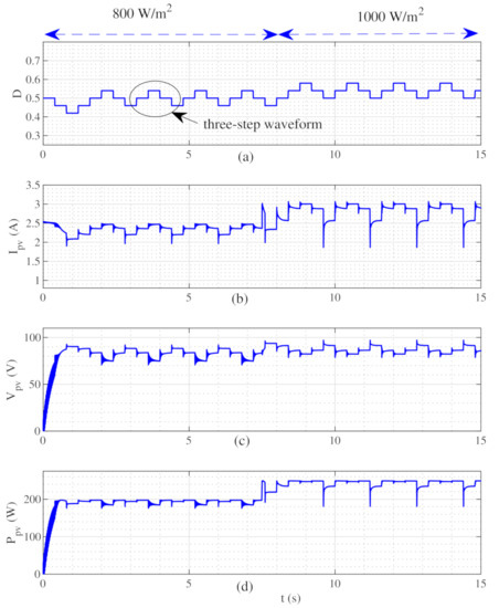 Figure 8a shows the variation of D for step change in G. The response settles in 1.5 s exhibiting a three step perturbation for W/m . A step change in G is introduced at t = 7.5 s, D settles to with three step response in less than 2 s. The overall response in Figure 8a proves the logical correctness of the P and O algorithm. However, the optimal performance of the algorithm depends on the correct choice of the step size and the sampling time [12]. Figure 8b–d shows the response of . All three variables exhibit three-step waveform around steady-state values indicated in Table 2 for step change in G.