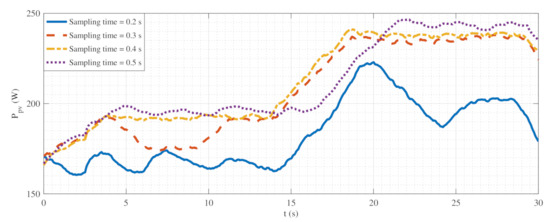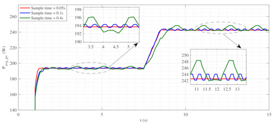 Tests are conducted on the system for three different sampling times, 0.4 s, 0.1 s and 0.05 s, to quantify its effect on the energy extraction. The power obtained for different sampling times is averaged for 1 s and is plotted in Figure 10. The energy extraction is highest for a sampling time of 0.4 s. This can be attributed to three-step waveform of & observed in Figure 8. The response shows that the sampling time of 0.4 s is appropriate for chosen . The average power is seen to be decreased for a sampling time of 0.1 s, which can be explained with Figure 9 exhibiting noisy response due to reduced sampling time for chosen . Further, the average power is observed to be least for sampling time of 0.05 s. The response of & exhibits chaotic behavior for reduced sampling time with large deviations from the steady-state MPP leading to poor energy extraction.