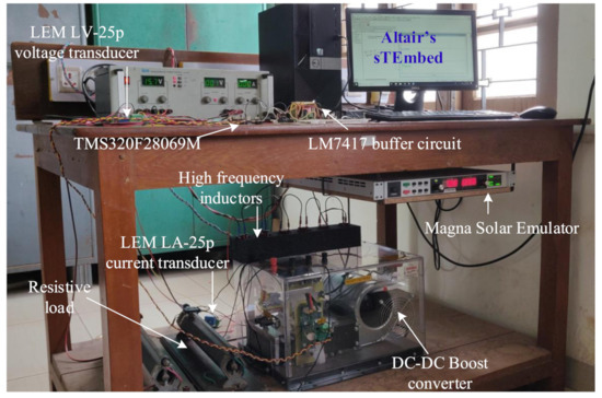 This section presents the experimental set-up developed for conceptual validation, the details of uncertainty in measured variables and results of experimentation. For experimental studies, a semikron making DC-DC boost converter feeding a resistive load is employed for maximum power extraction. Magna SL 300-5 Emulator (Magna-Power Electronics, Flemington, NJ, USA) is used to emulate solar PV profiles shown in Figure 3 and Figure 4. Classic P and O algorithm is implemented using Texas Instrument’s TMS320F28069M DSP (Texas Instruments, Dallas, TX, USA) [26].
