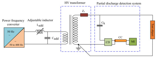 The developed system with the equivalent circuit shown in Figure 3 is composed of a power frequency converter, an additional inductor, an additional capacitor, an HV testing transformer, and a partial discharge detection system. Zf, Ck, CD, CC, and MI stand for the internal impedance of the testing transformer, the coupling capacitor, the coupling device or the measuring impedance, the measuring cable, and the measuring instrument, respectively.